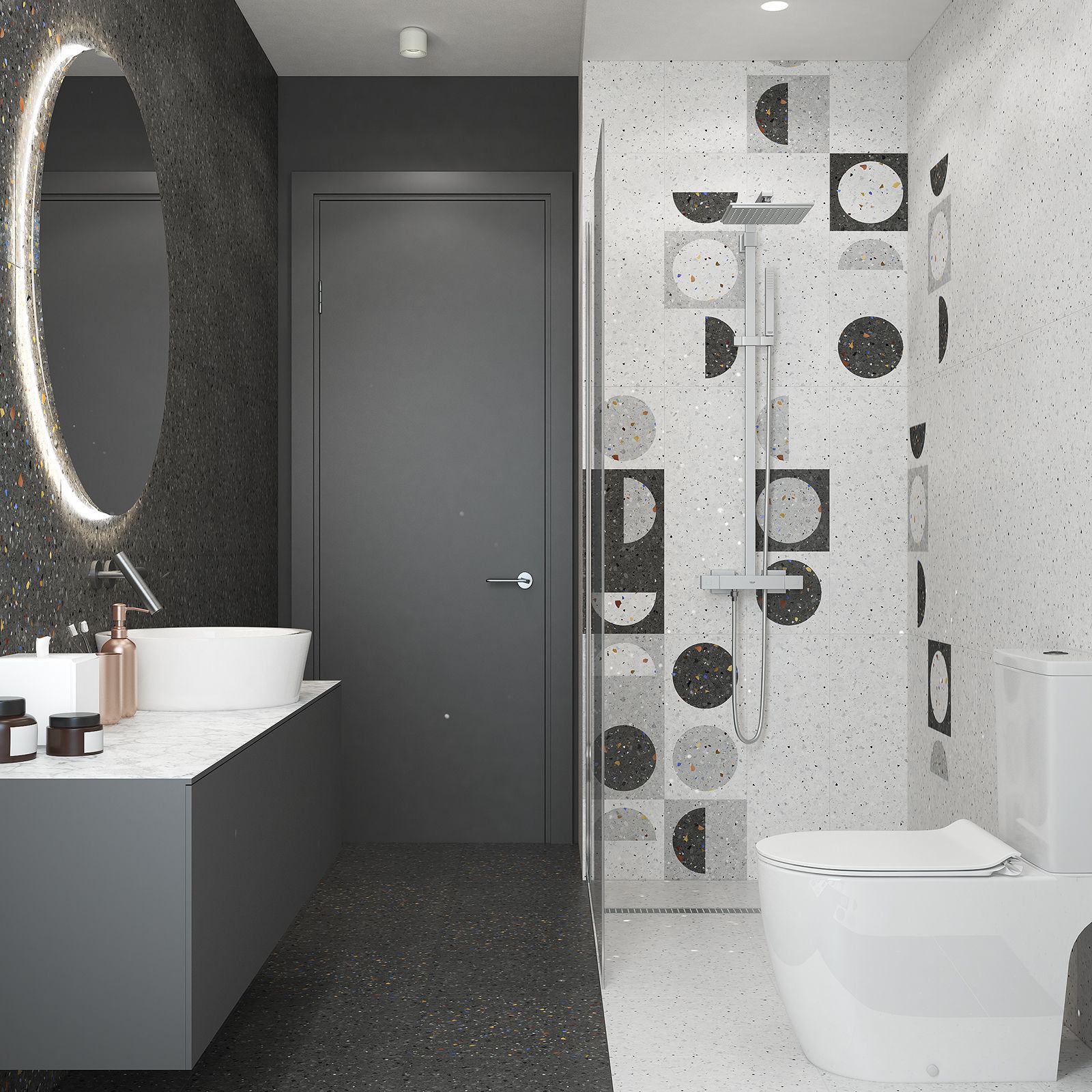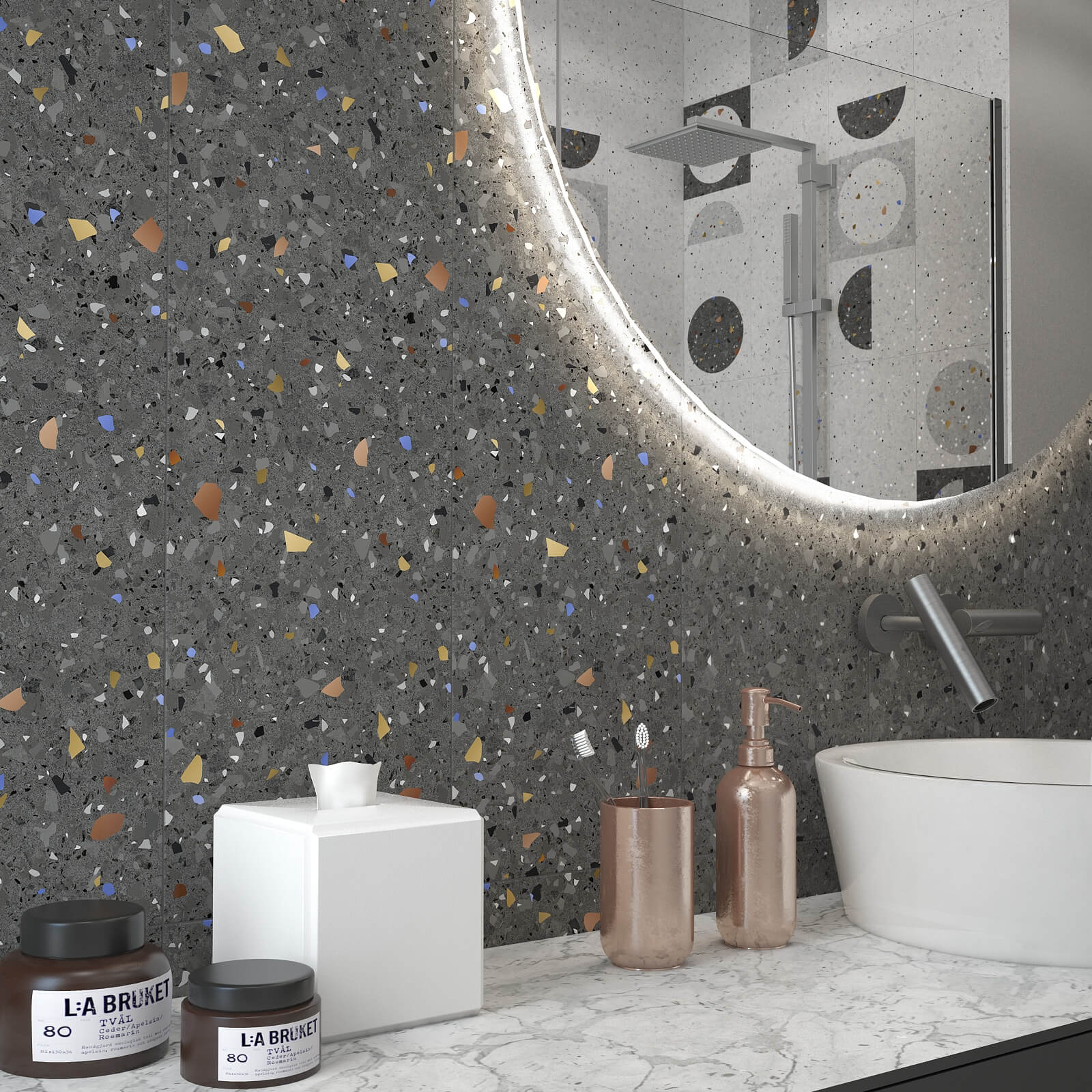 Серия Мари Эрми — современная интерпретация плитки Терраццо, бестселлера последних лет. Яркие вкрапления венецианской крошки из цветного стекла и фарфора оттеняют фактуру матовой глазури, делают пространство более легким и наполняют его солнечным светом.