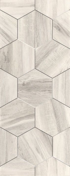 Настенная плитка Миф 7 20х50 см, толщина 9.5 мм, цвет бежевый, поверхность матовая, рельеф - геометрия, шестиугольники, фактура под дерево. Коллекция керамической плитки Миф от Керамин (Беларусь).