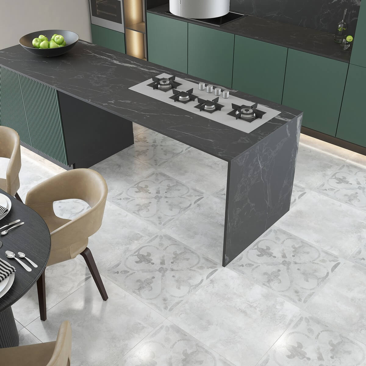 В дизайне керамогранита Турин мы воплотили сочетание старины и современности. Фактура бетона на подполированной глазури придает серии изысканную винтажность, а большой размер 600х600 мм и насыщенный цвет делают материал актуальным для современных интерьерных решений. Декор серии Турин —это изящные узоры, которые придадут интерьеру шарм старинных итальянских дворцов.