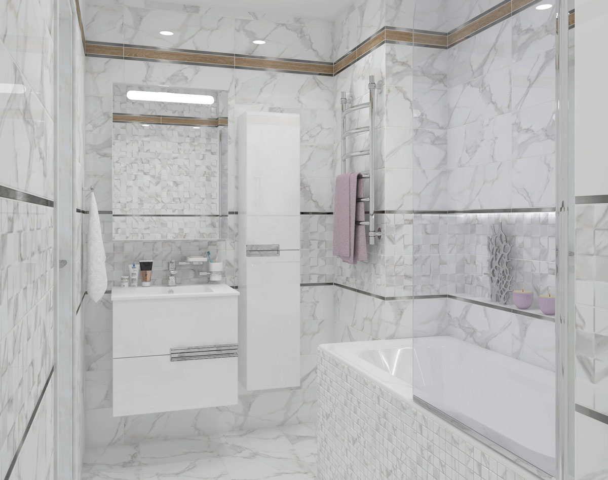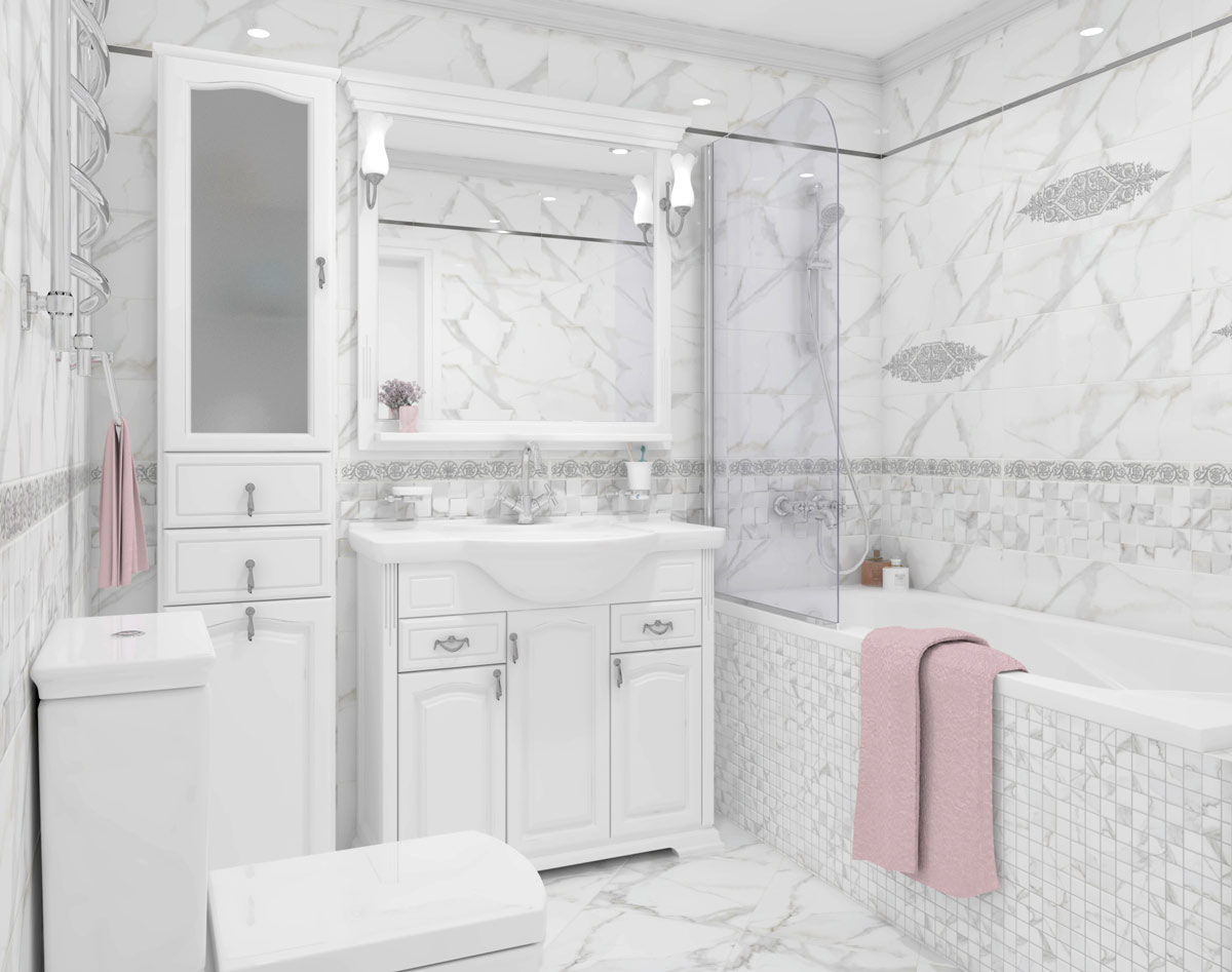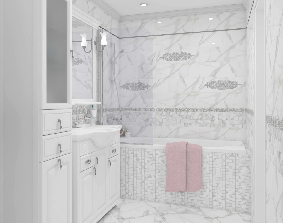 Кассиопея / Cassiopea от Laparet / Ceramica Classic - коллекция керамической плитки для ванной комнаты под мрамор в оттенках белого с серыми прожилками. В коллекцию включены настенная плитка 20х60 см, мозаичный декор, напольная 40х40 см. Коллекция Cassiopea от Laparet отличается красотой благородного классического мрамора, солидным и изысканным орнаментом декоров. Находясь в такой ванной комнате, вы будете чувствовать себя как в древне-греческом храме или героем мифологической поднебесной Олимпа. Плитка Cassiopea имеет глянцевую поверхность.