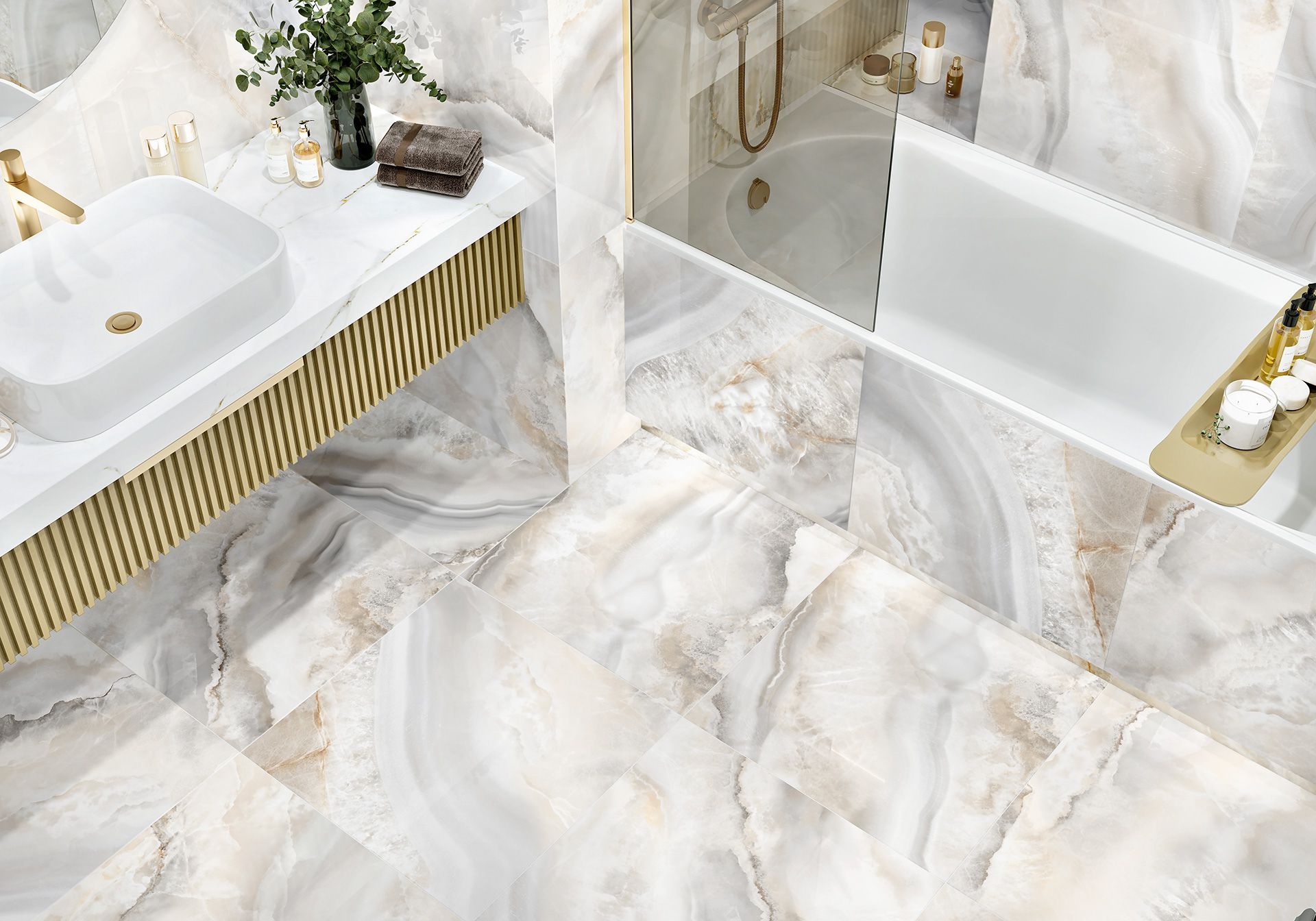 Эффектный Agate Pheonix состоит из текстур полудрагоценных минералов, соединённых из разных фрагментов в единое полотно. Его происхождение удивительное: эти небольшие жеоды образуются в вулканической породе глубокого залегания. Поэтому каждый такой фрагмент похож на произведение искусства. Разновидность рисунка «Феникс» похожа на яркую вспышку, которая разгорается от центра к краям с постепенным затуханием, образуя разноцветные градиенты и плавные переходы с небольшими кристаллическими элементами. Этот керамогранит будет отлично гармонировать с натуральным фактурным деревом неправильной формы, дополнением ему может послужить Snow Onyx. В одиночном варианте Agate Pheonix станет ярким акцентом, приковывающим к себе всё внимание.