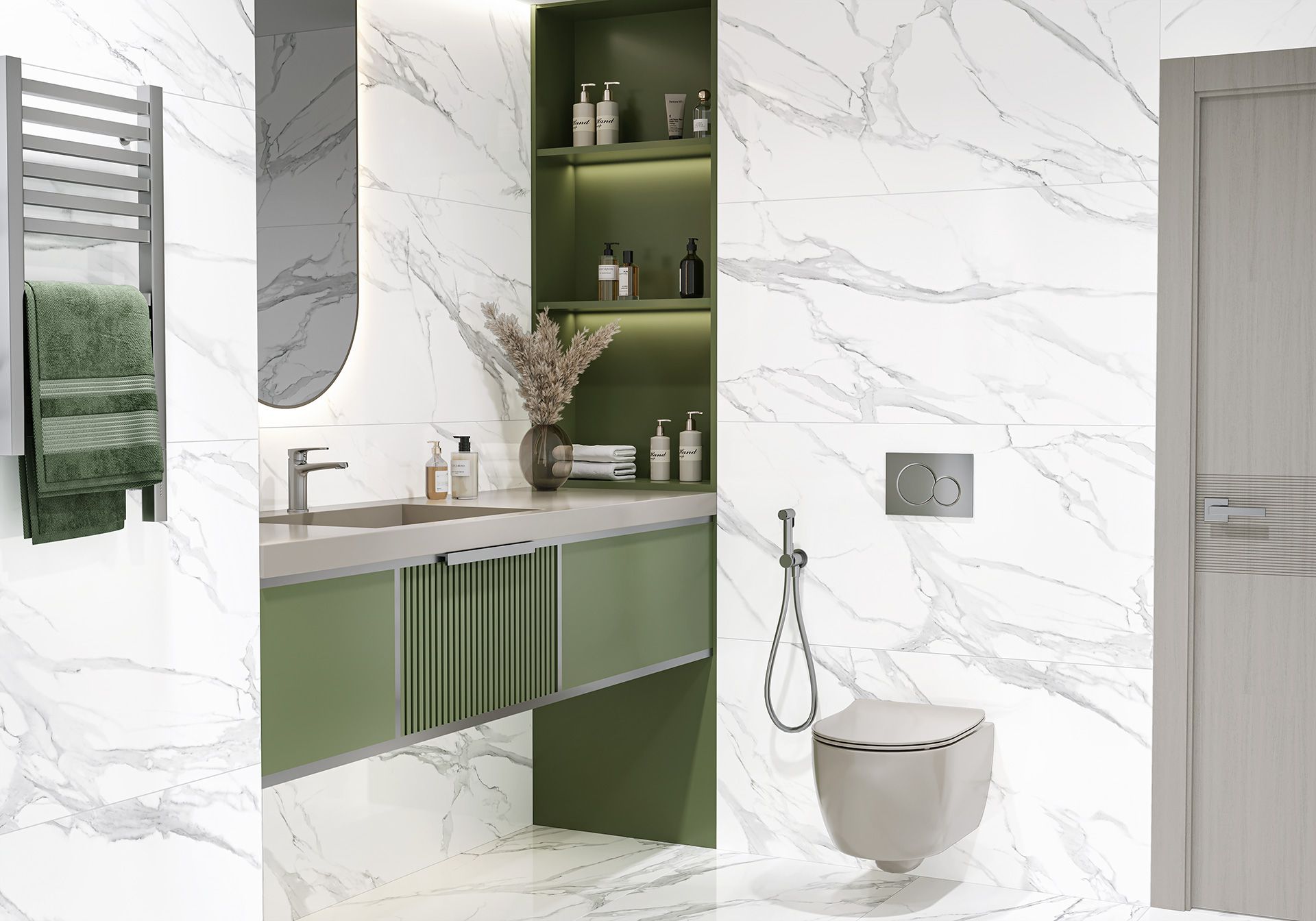 Текстура Calacatta Montreal является классическим воплощением бело-серого мрамора. Такой керамогранит не устареет и не надоест со временем, он будет отличным решением для использования как в небольших пространствах, так и в помещениях с большой площадью. Он не перегружает пространство, с такой текстурой гармонично будет смотреться любая мебель и аксессуары. Красивым сочетанием станет текстура дерева и яркие металлические аксессуары, также гармоничным решением будет комбинирование с чёрной сантехникой и мебелью. Calacatta Montreal сочетается с Imperial, Persia Graphite, Domines.