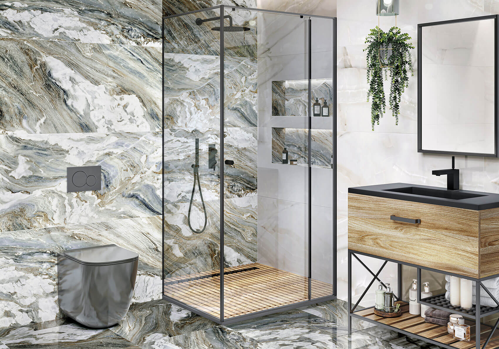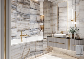 Полированный керамогранит Cascade имеет текстуру неподражаемого кварцита Tempest Quartzite. Такой рисунок сочетает в себе множество цветов и оттенков от кофейно-древесных до бирюзово-изумрудных с дымчато-сизыми полутонами. Кварцит является неоднородной породой и подразумевает разнообразные размолы, вкрапления других пород и закрученные вихри текстур, слитых воедино. Поэтому каждое лицо этого артикула — словно живописная картина, нарисованная самой природой. Cascade сочетается с Statuario Silver, Twilight Calacatta, Domines, Barcelo White, Snow Onyx, Ice Onyx.