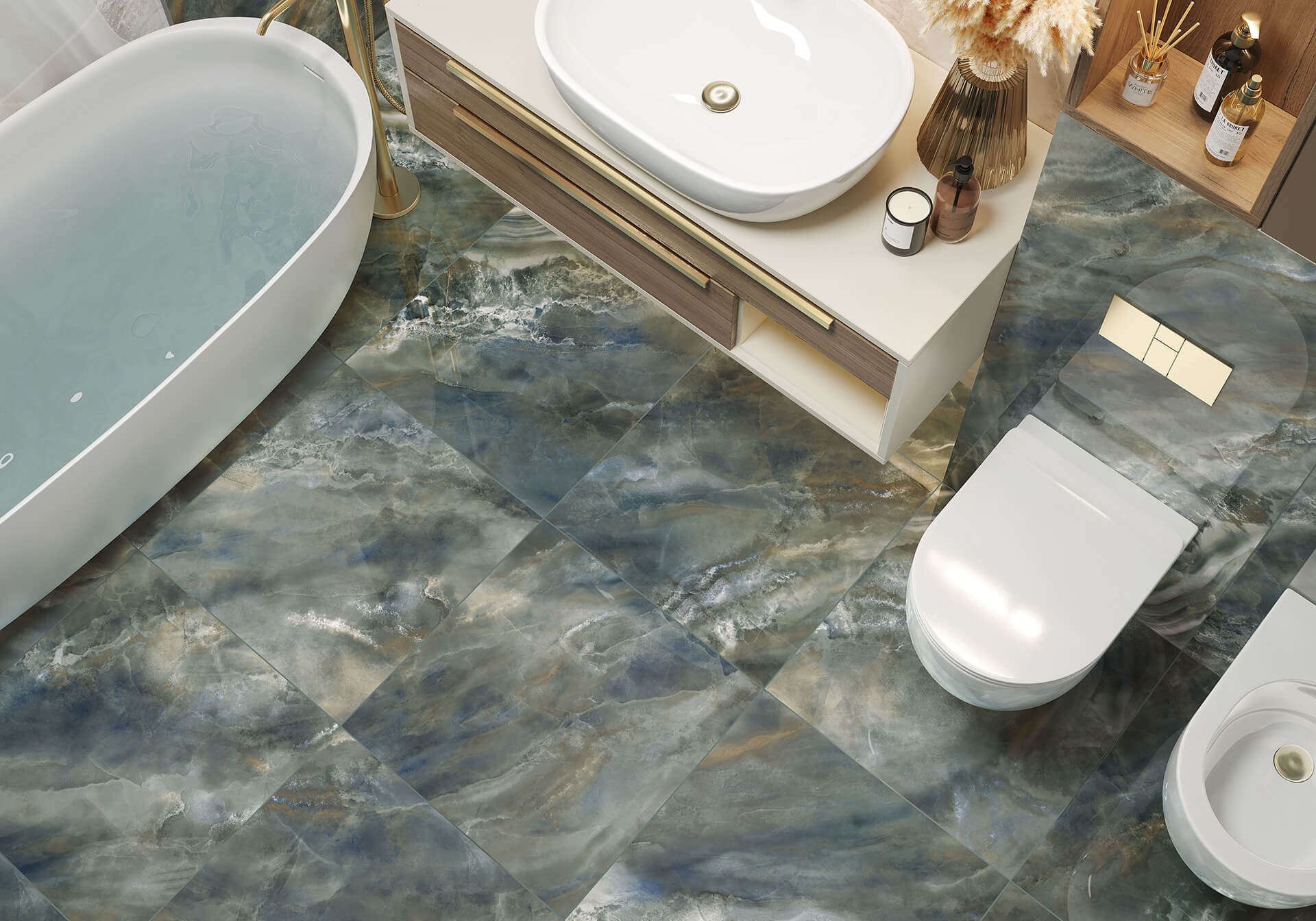 Экзотический сорт дымчатого оникса представлен в двух насыщенных цветах. Один — в бежево-песчаных оттенках с глубокими градиентами коричнево-терракотовых и белых волн. Второй — всех оттенков сине-зелёной гаммы с тёплыми градиентами. Этот эффектный керамогранит будет центром притяжения в интерьере. Он станет стильным решением не только для санузла, но и для гостиной, также им можно выделить зону TV или зону столовой, использовать в кухонном пространстве. С ним можно создать практически безграничное количество вариантов для дизайна интерьера и экстерьера. Columbia сочетается с American Calacatta, Domines, Limestone, Snow Onyx, Sandy Carrara, Ice Onyx.