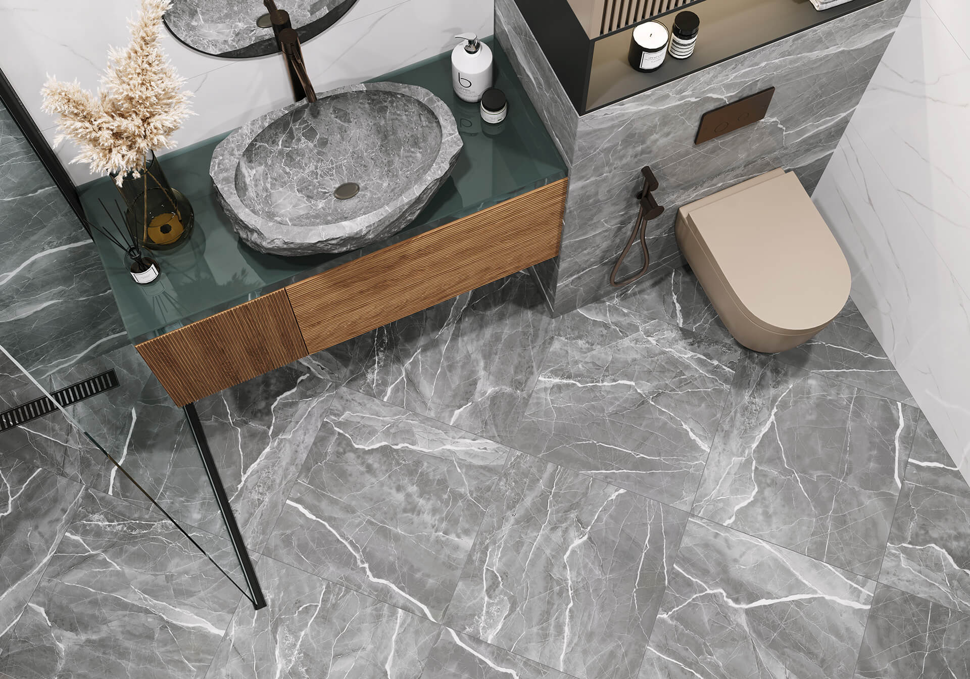 Рисунок классического ярко-серого итальянского мрамора Imperial является эффектным акцентом в интерьере. Его белые жилы и полупрозрачные каменные разломы с градиентами серых оттенков завораживают своей глубиной, а полированная поверхность ещё больше усиливает объёмную графику мрамора на поверхности керамогранита. Этот обволакивающий цвет сочетается с яркой текстурой дерева и металлическими аксессуарами. Классическим сочетанием станут все артикулы бело-серых мраморов линейки, например, Dallas Silver или Atlantic Marble.