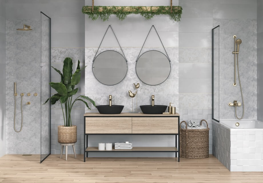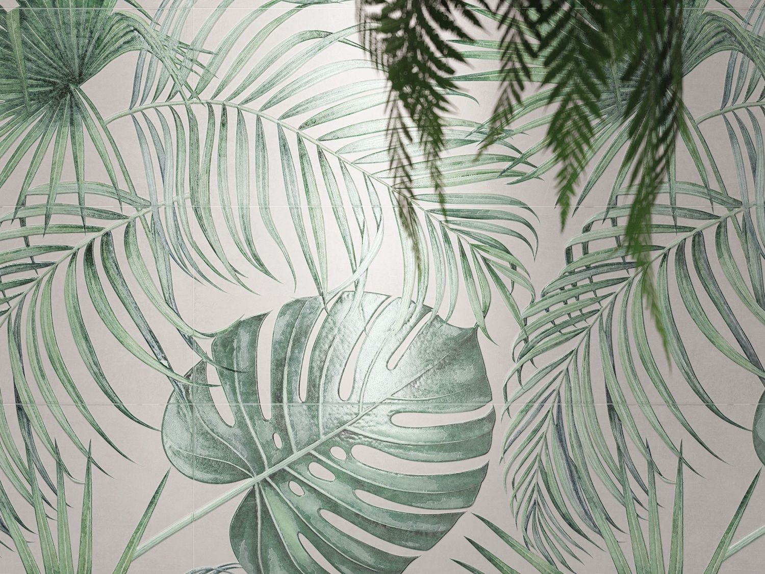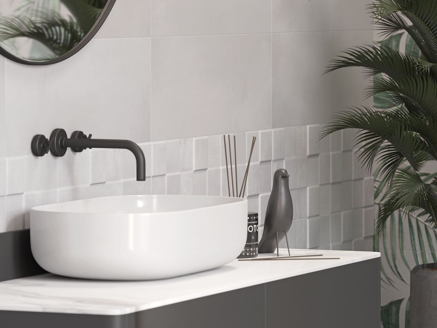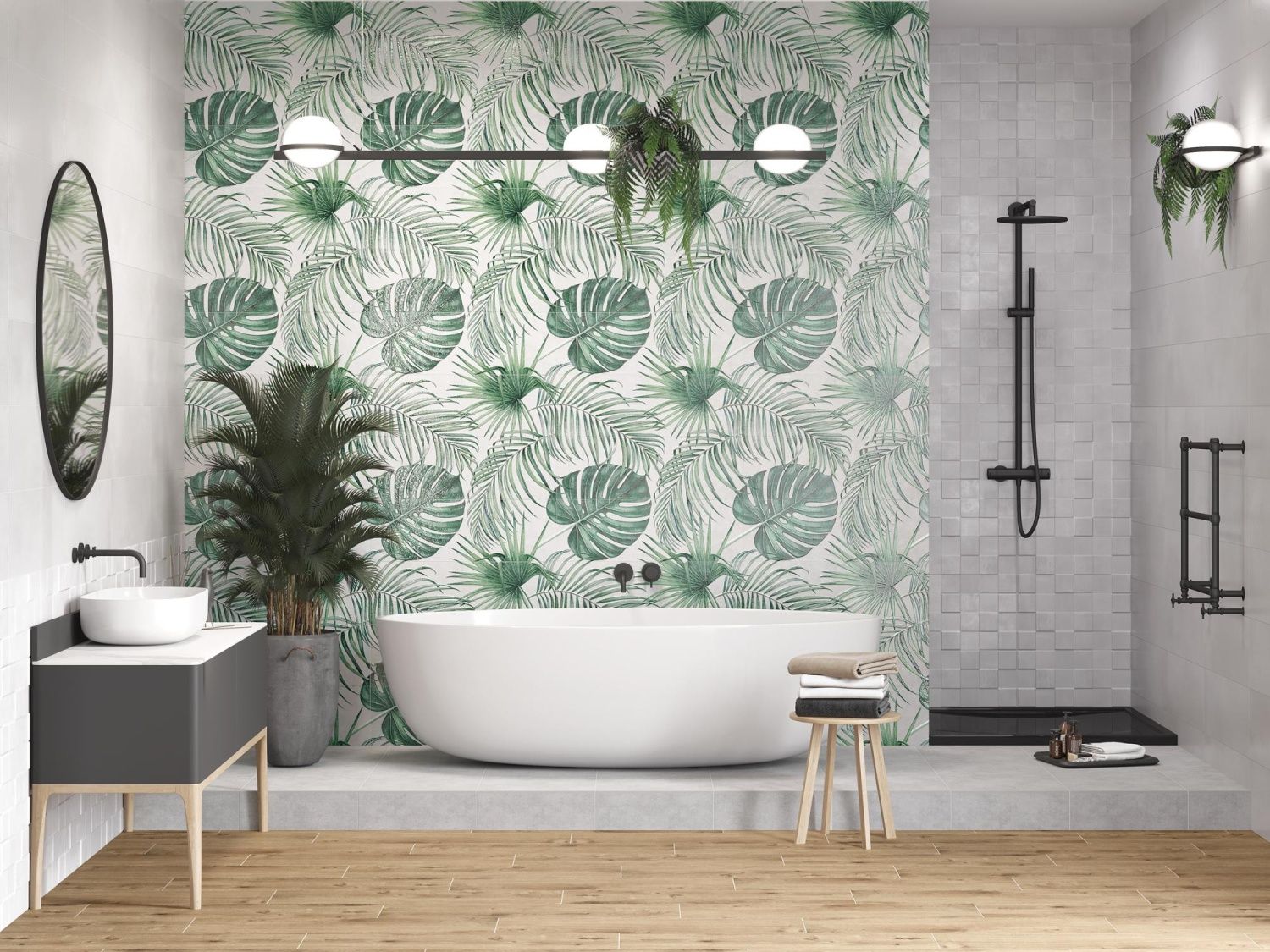 Боско Вертикале / Bosco Verticale (Meissen Keramik, Германия) - коллекция настенной керамической плитки для ванной. Плитка имеет матовую поверхность. BOSCO VERTICALE — это современная коллекция керамической плитки, в которой фактура бетона сочетается с флористическими декорами. Источником вдохновения для неё стали небоскребы Bosco Verticale в Милане. Фоновая плитка коллекции Bosco Verticale с матовой поверхностью воспроизводит фактуру бетона. Рельеф из разнонаправленных бетонных квадратов продолжает урбанистическую тему. Коллекцию дополняет панно с флористическим принтом, стыкующимся во все стороны. Это позволит легко наполнить рисунком большие пространства. Роскошные тропические листья создадут в ванной особую атмосферу, освежая минималистичный интерьер. Альтернативный вариант интерьера — плитка с принтом из листьев, будто проглядывающих сквозь туман. Золотые блики оживляют тактильно приятный рисунок, добавляя в него мягкое свечение.