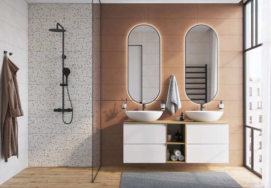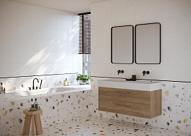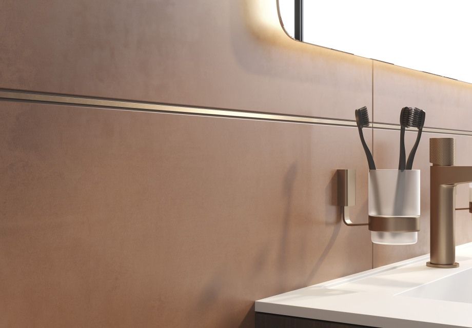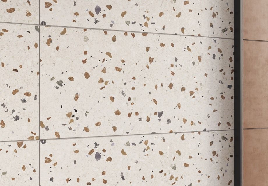 Традиционные цвета керамики в современном прочтении представлены в коллекции настенной плитки FRAGMENTI формата 25х75. В её основу лёг тренд международной керамической выставки — терракотовый оттенок, цвет обожжённой глины. Дизайнеры нанесли его на не менее актуальную текстуру бетона, которая прослеживается и у бежевой базы. Матовые эффекты создают красивое сияние при игре света на поверхности. Декоративную роль выполняет фоновая плитка с рисунком терраццо. Концепцию завершают золотисто-медный бордюр и керамогранит «под дерево» на пол.