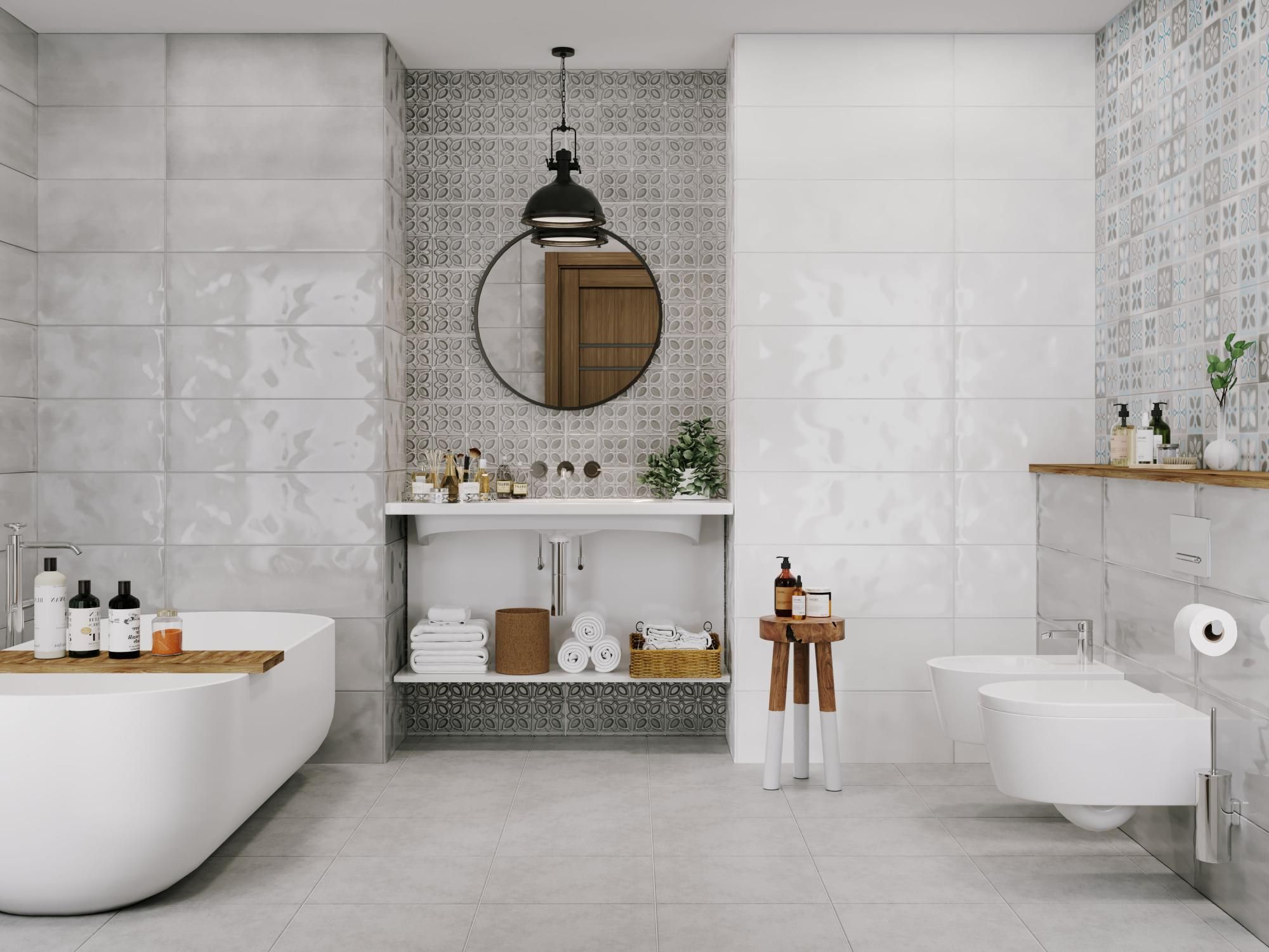 Декоративная плитка с сатиновой поверхностью и деликатным блеском люстра объединяет три базовых цвета. Матовый ультратонкий бордюр серебристого цвета дополняет гармонию блестящих и матовых поверхностей. Разнообразие фактур коллекции позволит удачно зонировать пространство ванной комнаты или кухни. Коллекция мотивы в интерьере – это всегда свежо и необычно. Коллекция LISSABON в белом и прохладном сером цвете продолжает концепцию этнических паттернов в интерьере. Серо-белая гамма с вкраплением ярких бирюзовых мотивов в рисунке декоративной плитки подойдет не только для отделки ванной комнаты.
