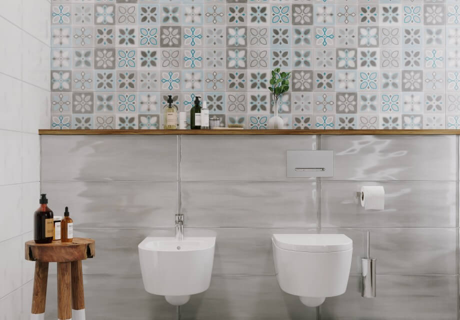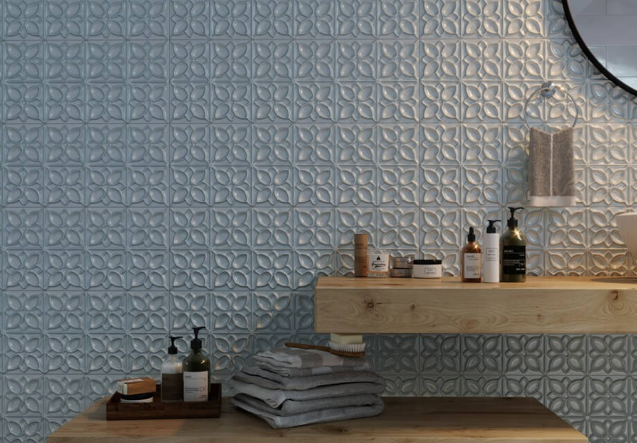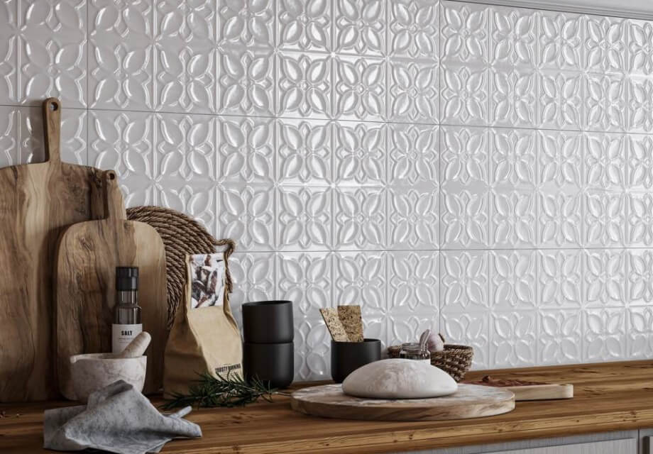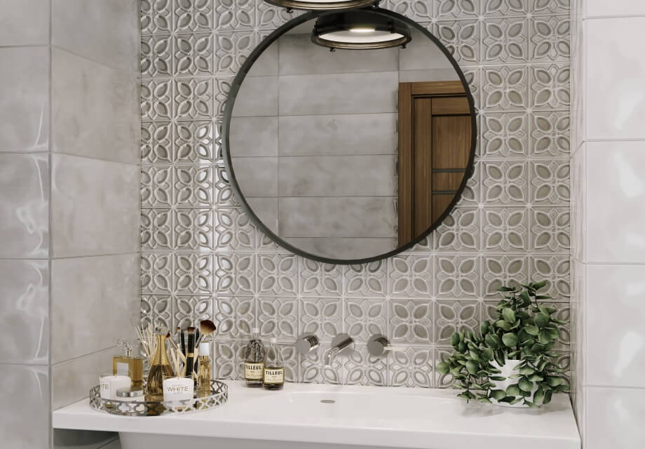 Белая плитка, тонированная под старину, придает интерьеру легкий флер романтичности. Простые рельефы, выполненные вручную, повторяют очертания вставки с орнаментом.