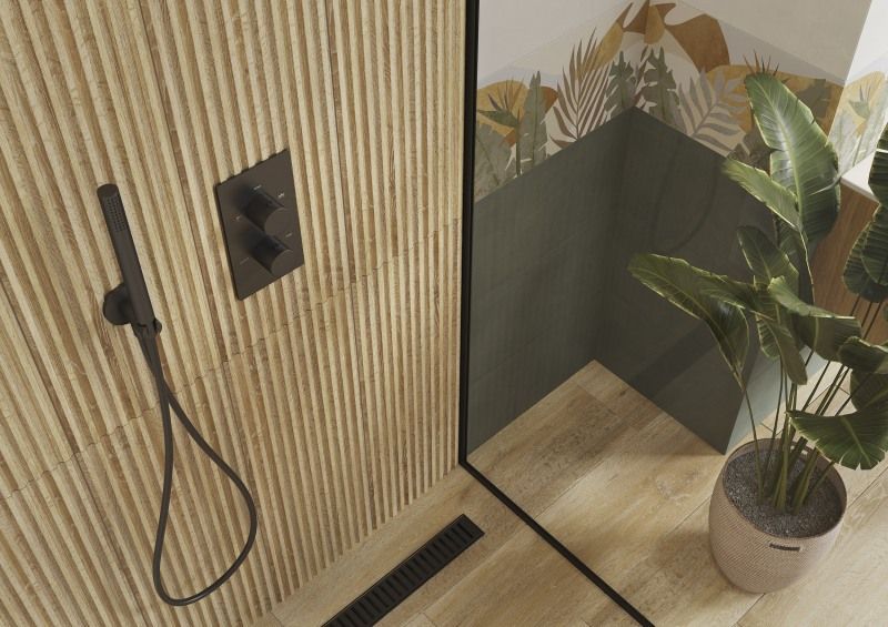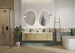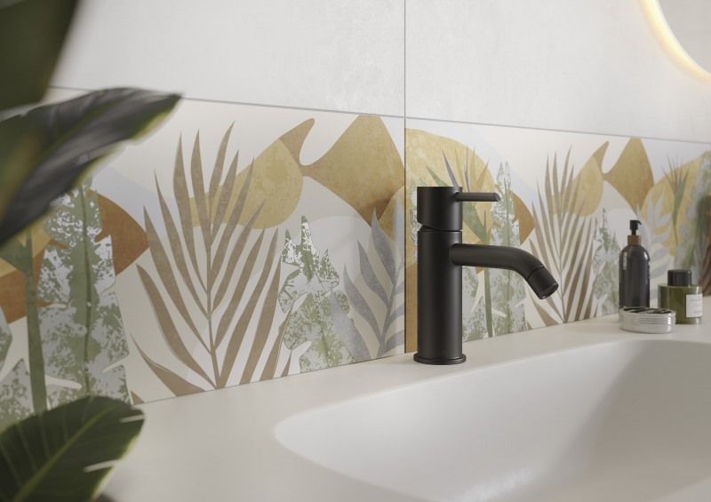 Коллекция керамической плитки NEW GARDEN формата 25х75 наполнена игрой. В её основе милый растительный декор, словно сошедший с ретро-открытки, но дизайнерский и модный. Фоном служат фигуры деликатных оттенков, в неправильных формах которых угадывается стиль мемфис. Игра продолжается в комбинации плоских и объёмных поверхностей, натуралистичной текстуры дерева и зелёного «крашенного бетона». Декорации с нежным мерцанием на вставке можно усилить золотистым металлическим бордюром шириной 0,5 см. Природную тематику поддерживают «керамогранитные доски» спокойного коричневого оттенка.