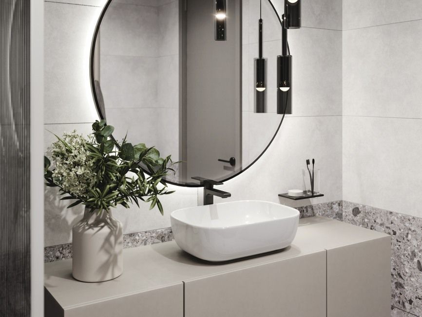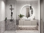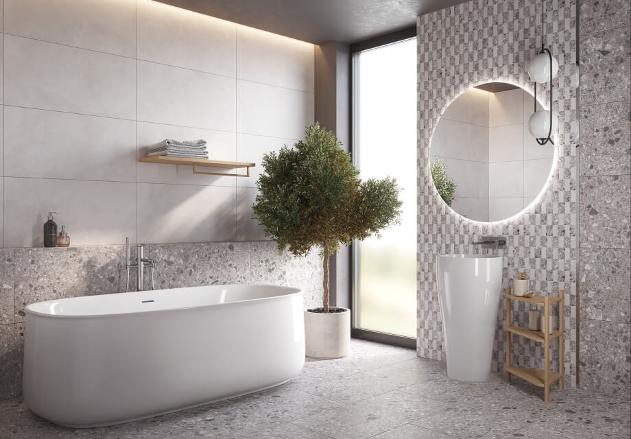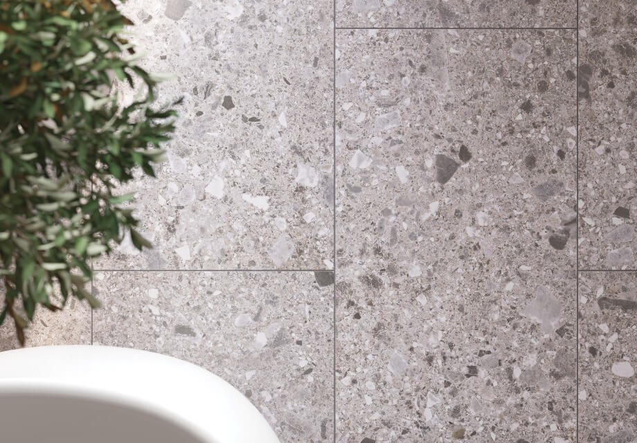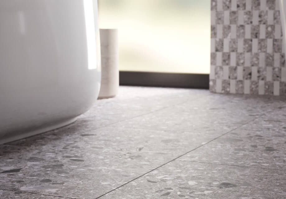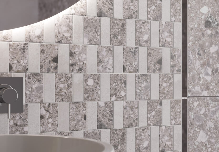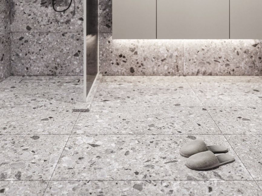 Динамичный и мерцающий глазурованный керамогранит коллекции SKIN воплощает тренд на терраццо. Матовая ректифицированная плитка подойдёт для отделки функциональных зон в ванной, санузле, в коридоре, гостиной и на кухне. Объём рисунку придают глянцевые эффекты, с помощью которых подчеркнуты отдельные вкрапления камней в бетон. Несколько различных рисунков позволят красиво выложить керамогранит при монтаже. Перед укладкой материала нужно сделать выкладку на полу, чтобы добиться максимального визуального эффекта. Материал с ректифицированными краями можно укладывать с минимальным швом, чтобы поверхность смотрелась цельной. Керамогранит не боится перепадов температур, поэтому им можно отделывать лоджии и крытые уличные террасы.