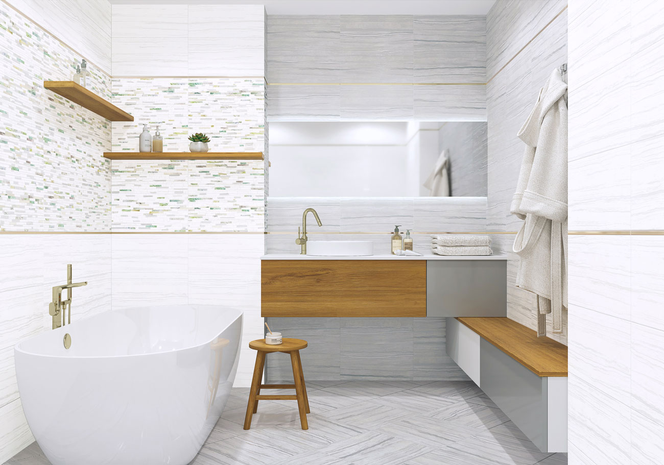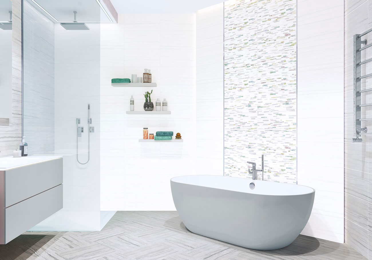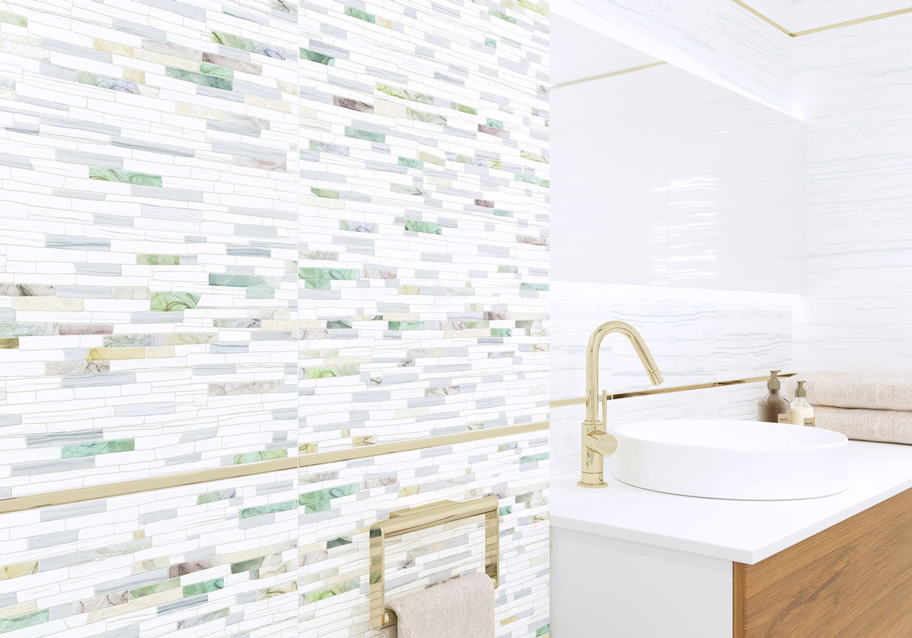 Джемстоун / Gemstone от New Trend (Россия) - коллекция керамической плитки 249*500 мм для ванной комнаты. Коллекция плитки Gemstone — это мерцающие линии на матовой текстуре мрамора и оригинальный мозаичный микс из градиентных разноцветных элементов, напоминающих драгоценные камни. Яркие разноразмерные вставки на плитке Intel дополнительно декорированы объемной гранилью, которая переливается и играет на свету, а металлизированный бордюр дополнит стильный образ интерьера.
