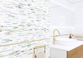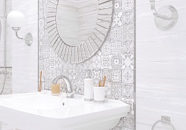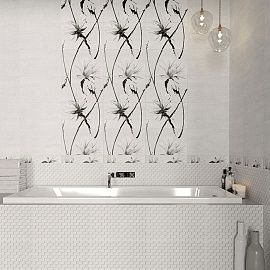 Конор / Konor от NewTrend (Россия) - коллекция керамической плитки 249*500 мм для ванной комнаты. Коллекция Konor в бело-серых цветах — неожиданный, но стильный фьюжн бетона и флористики. Реалистичная цементная текстура уравновешивается изящным акварельным рисунком пальмовых ветвей на панно, дополненным серебряными линиями глиттера и листьями с зеркальным эффектом. Платиновый бордюр-стик подчеркнет тональность коллекции и будет хорошо сочетаться с хромированными аксессуарами.
