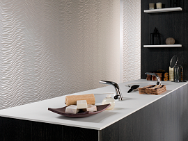 Коллекция керамической плитки для ванной Madagascar Ona от испанского бренда Venis включает плитку для пола и стен с фактурой под камень/бетон с выраженной пористостью. Плитка выпускается в трех цветовых решениях: белом, бежевом и сером. Настенная плитка выполнена в размере 33,3х100 см и дополнена структурированными модулями с волнообразным рельефом.