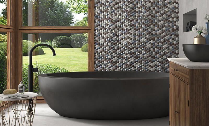 Испанская коллекция Vidrepur Elite включает стеклянную мозаику с глянцевой поверхностью. Мозаика состоит из выпуклых шестиугольных элементов и в цветовых решениях: серо-коричневом. Серо-коричневая мозаика обладает эффектом интерференции света: переливается сиреневым, голубым, перламутровым и другими оттенками.
