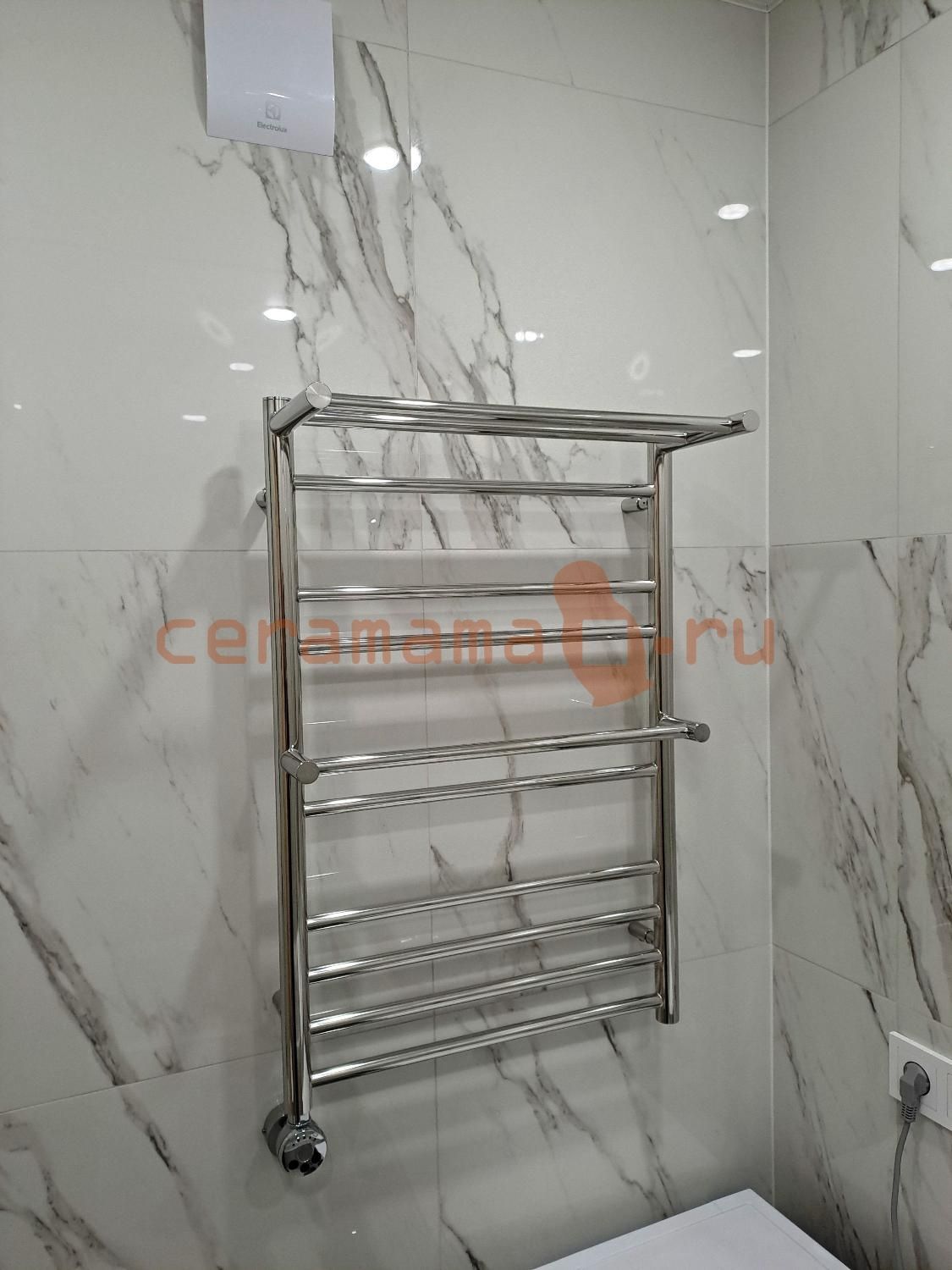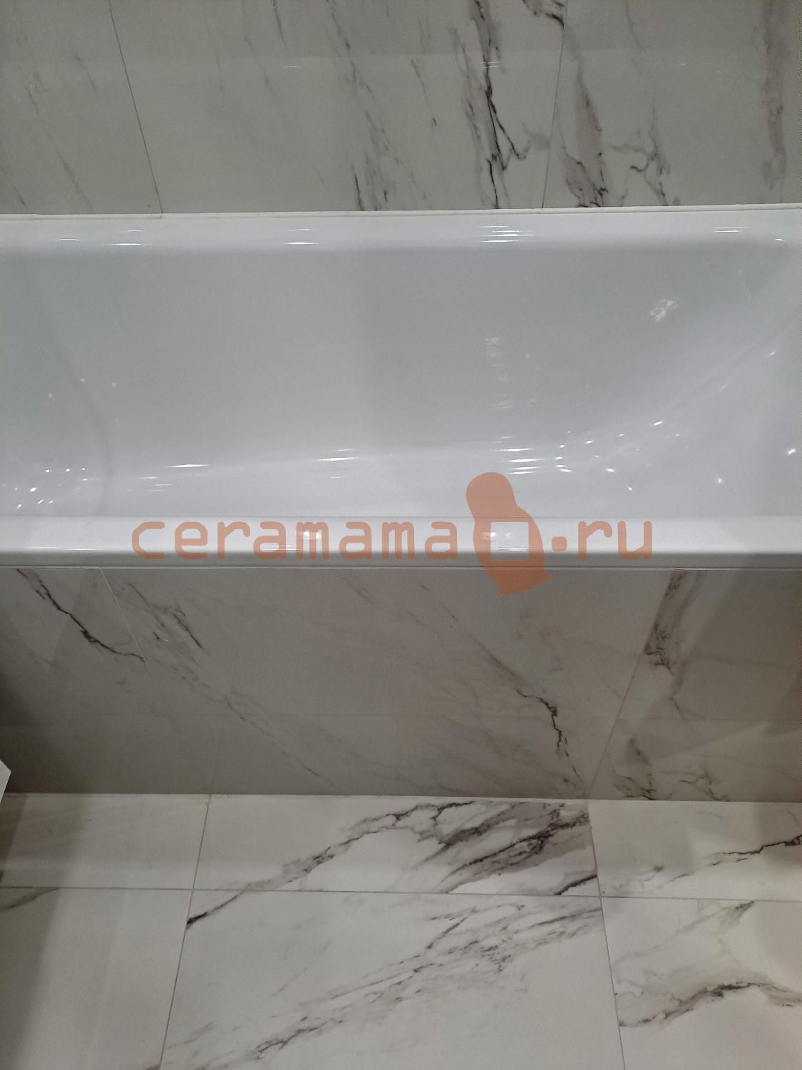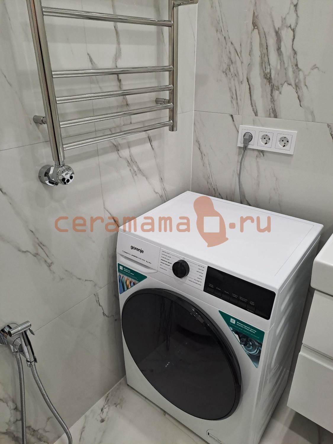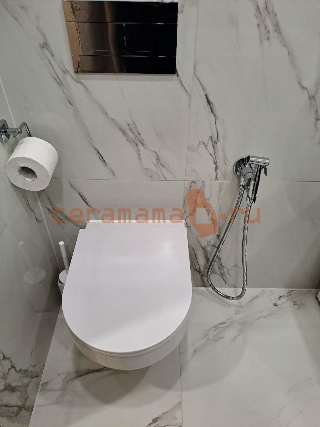 Ремонт закончен. Был выбран керамогранит Calacatta Superb с имитацией натурального мрамора. Она имеет белый цвет с тонкими серыми и золотистыми прожилками, что создает элегантный и изысканный вид. Эта плитка идеально подходит для создания классических и роскошных интерьеров, а также для облицовки ванных комнат, кухонь, гостиных и других помещений. Благодаря своему уникальному дизайну и прочности, Calacatta Superb является одним из самых популярных выборов среди дизайнеров и домовладельцев.